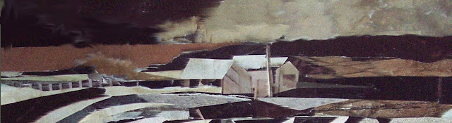 Magazine paper, preferably glossy, provides an unlimited color pallet and endless design and composition possibilities. For instance, in this first photo, where you see a furniture and drapery ad from a catalog, I see cliffs and waterfalls, similar to those I incorporated into my Cliff Dwellers landscape collage to the right of it.